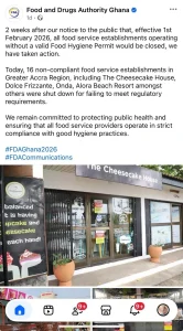 “Two weeks after our notice to the public… we have taken action,” the FDA said in a statement on its official Facebook page. “Today, 16 non-compliant food service establishments in Greater Accra Region… were shut down for failing to meet regulatory requirements.”