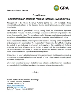 In a statement, GRA management said the action follows preliminary findings from an enforcement operation conducted on February 18, 2026. The operation involved transit cargo declared for onward movement to Niger, where discrepancies were detected in documentation and compliance with established customs procedures.