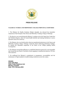 The Minister for Health, Kwabena Mintah Akandoh, has ordered the immediate suspension of the Principal of the Nurses and Midwifery Training College in Nalerigu in the North East Region following revelations of unauthorised admissions.
