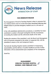 Korle Bu reaffirmed its commitment to accountability and pledged to update the public once the probe is concluded.
