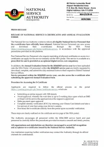 The NSA clarified that the service attracts a prescribed fee and is optional. It also announced that Annual Evaluation Forms for the 2024/2025 service year have been uploaded onto the portal. Personnel in the current service year are required to download, complete and submit the endorsed forms to their respective district offices before they can access their e-certificates.