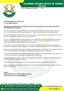 The Pilgrims Affairs Office of Ghana (PAOG) has announced the closure of all arrangements for the 2026 Hajj pilgrimage with immediate effect.