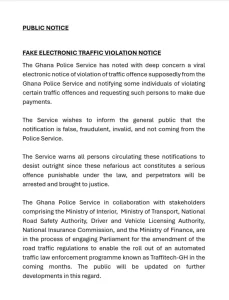 The Ghana Police Service has cautioned the public about a fraudulent electronic traffic violation notice circulating online, describing it as false and unauthorized.