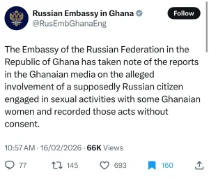 In a statement posted on X on Monday, February 16, 2026, the Embassy said the reports circulating in the Ghanaian media relate to claims that a supposed Russian citizen recorded sexual acts without the knowledge or approval of the women involved.